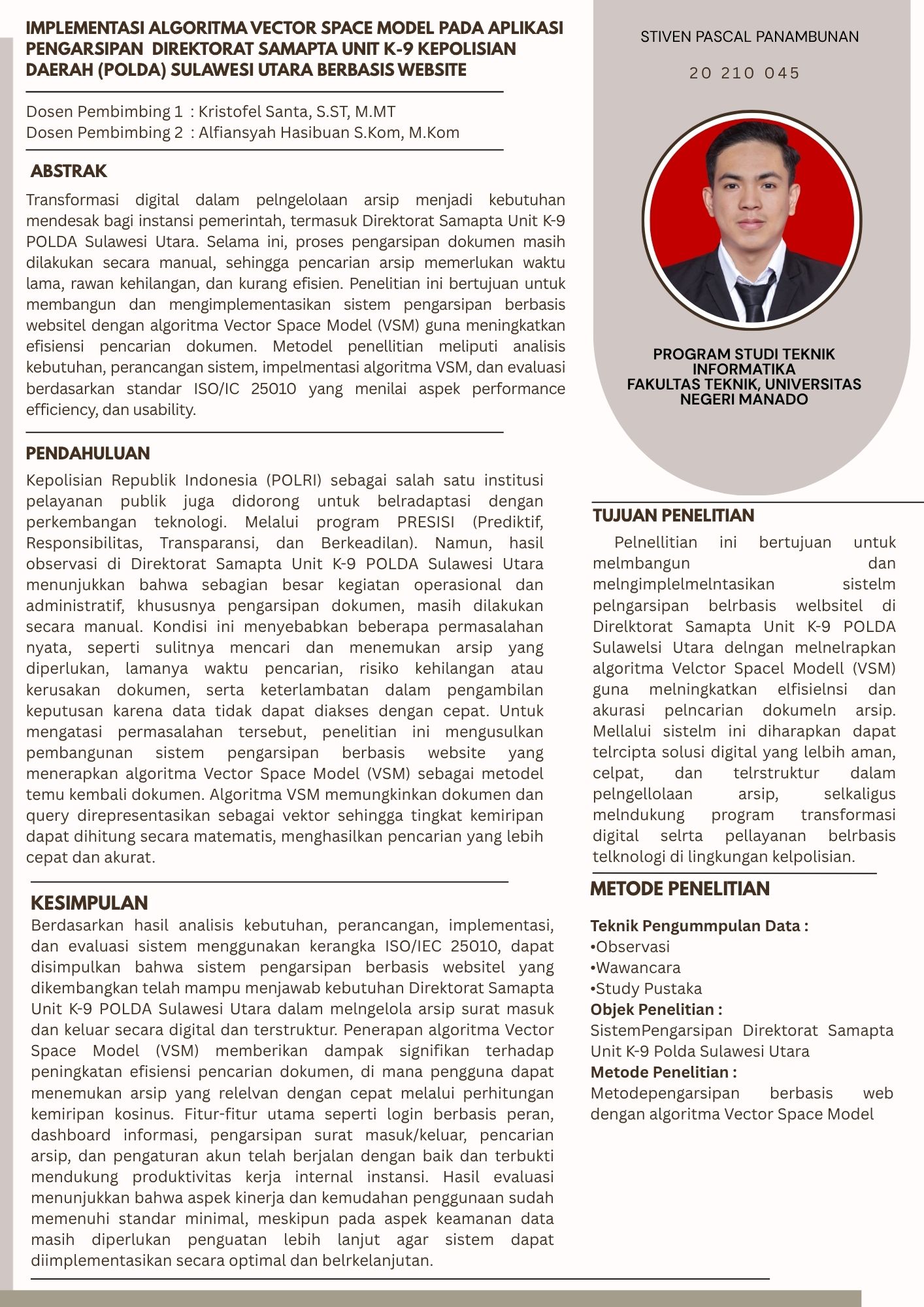 IMPLEMENTASI ALGORITMA VECTOR SPACE MODEL PADA APLIKASI PENGARSIPAN DIREKTORAT SAMAPTA UNIT K-9 KEPOLISIAN DAERAH (POLDA) SULAWESI UTARA BERBASIS WEBSITE